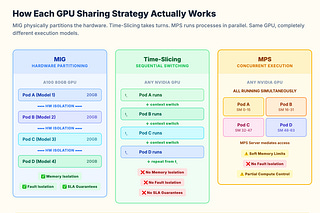 MIG partitions GPUs physically. Time-Slicing takes turns. MPS runs kernels in parallel. When to use each GPU sharing strategy on Kubernetes.