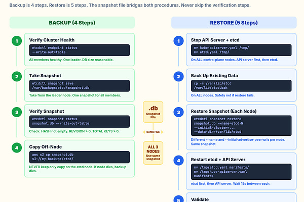 The step-by-step procedure for backing up and restoring etcd. Every command, every validation check, every gotcha.