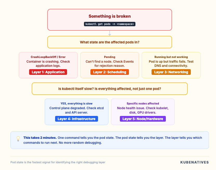 A systematic framework for debugging Kubernetes in production. Five layers from application to hardware, with the exact commands for each layer.