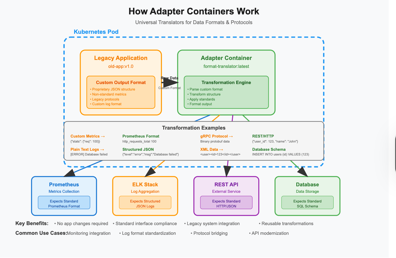 Adapter containers are specialized containers that transform data, protocols, or interfaces between your main application and external systems. They act as translators, converting one format or protocol to another while running alongside your application.