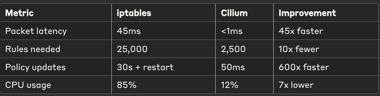 Your Kubernetes cluster has 500 pods. Your iptables has 15,000 rules. Each packet takes 45ms to process.