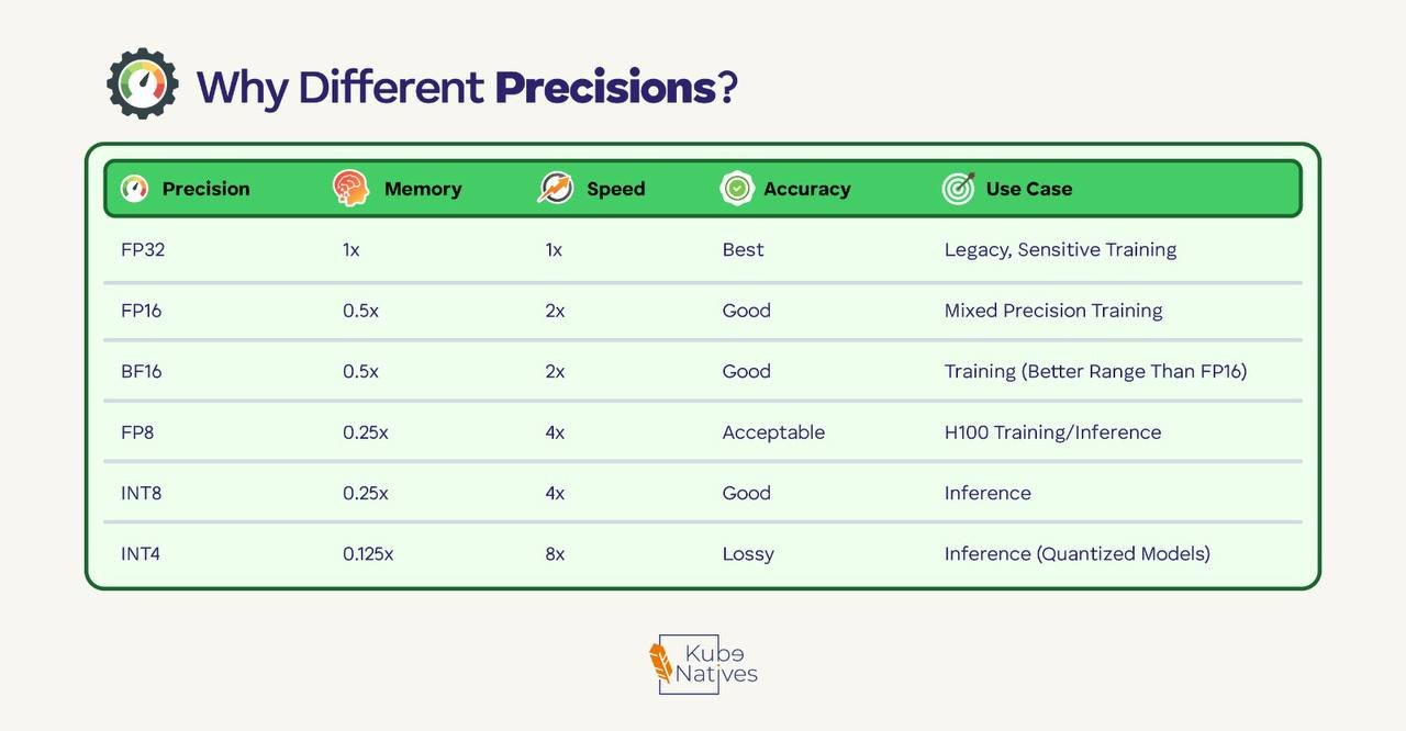 The H100’s “Transformer Engine” automatically switches between FP8 and FP16 — using lower precision where safe, higher where it matters. This is a big part of why H100 is faster than A100 for transformers.