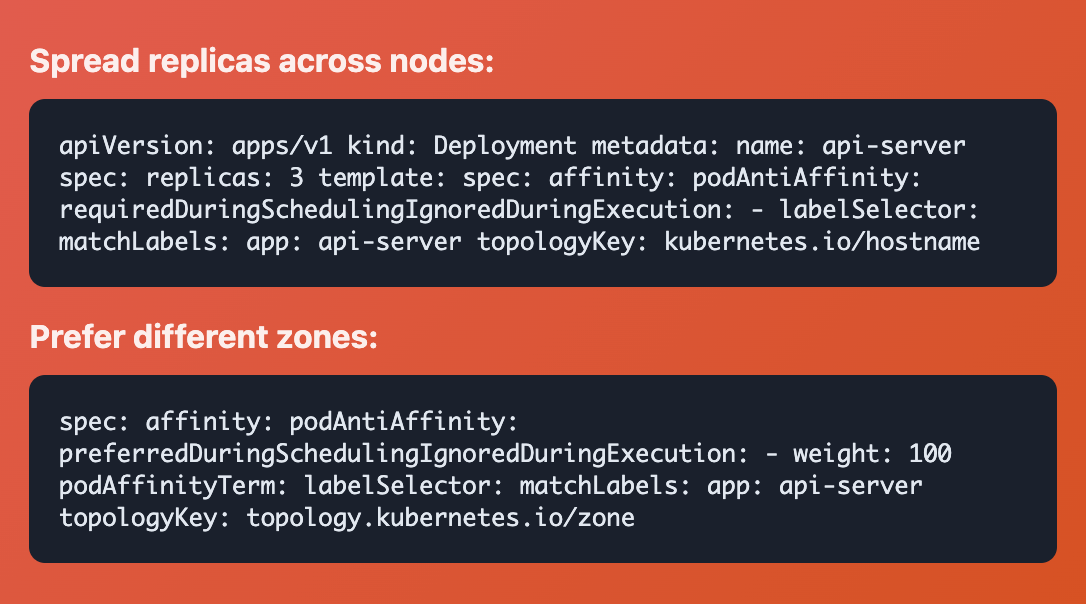 → Use Pod Anti-Affinity (spread replicas, avoid conflicts)