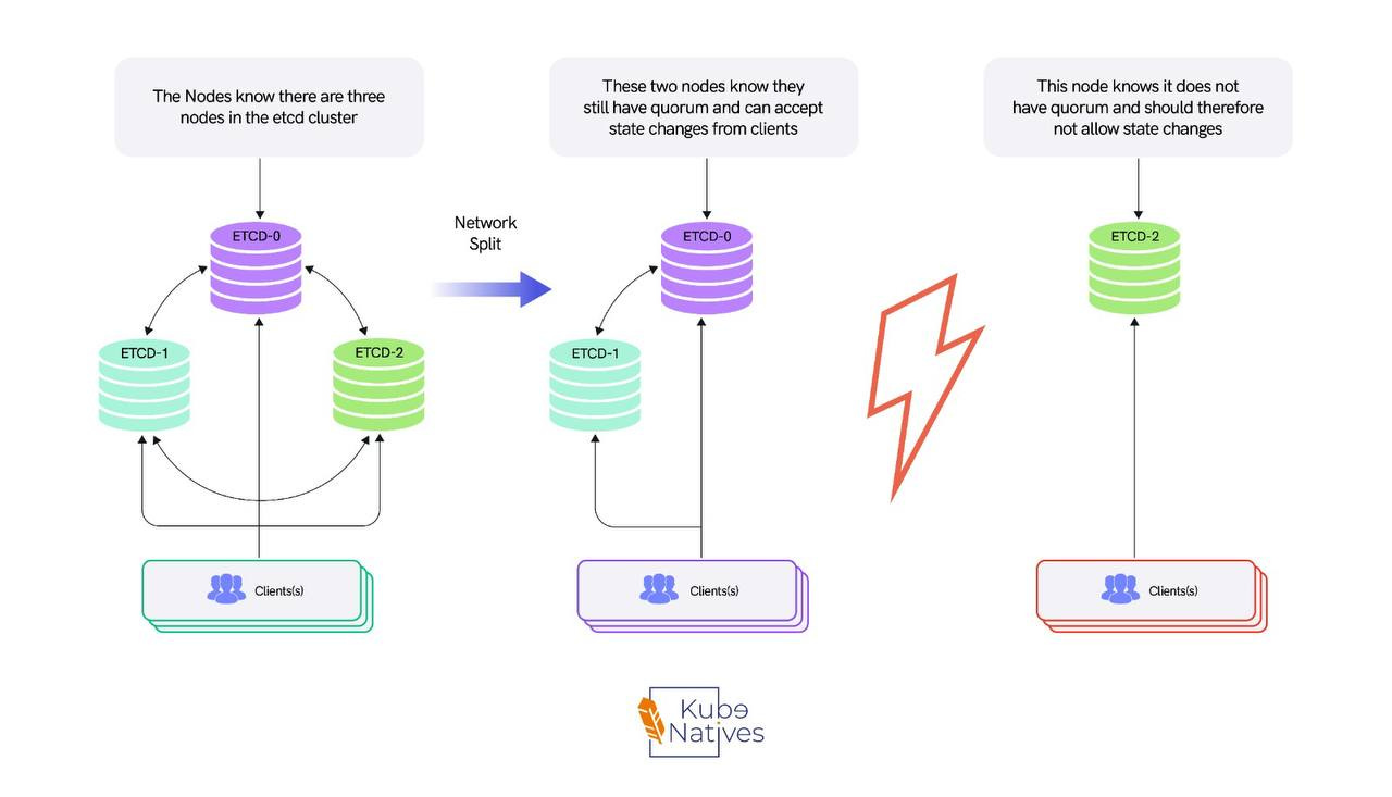 Every write needs majority agreement from the cluster members before it’s committed. In a 3-node etcd cluster, that’s 2 out of 3.