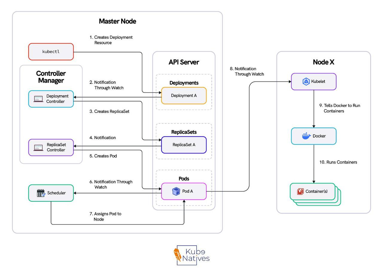 Step 6: The controller manager is watching pod status through the API server. If the pod crashes, the ReplicaSet controller notices the actual count doesn’t match the desired count and creates a replacement, starting the cycle again.