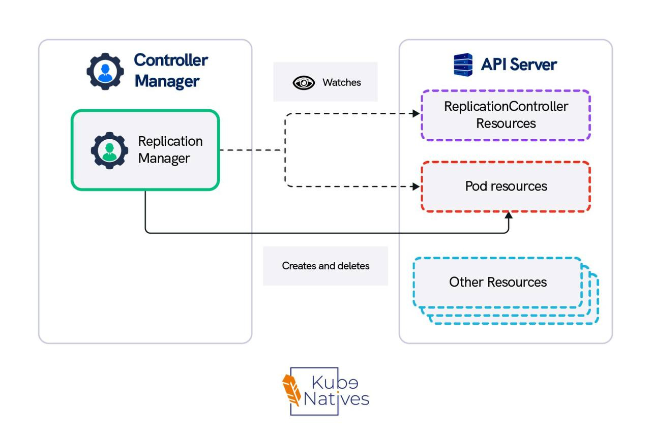 The Deployment controller manages rollouts. The Node controller detects unhealthy nodes. Each controller watches the API server for changes and takes corrective action when the actual state drifts from the desired state.