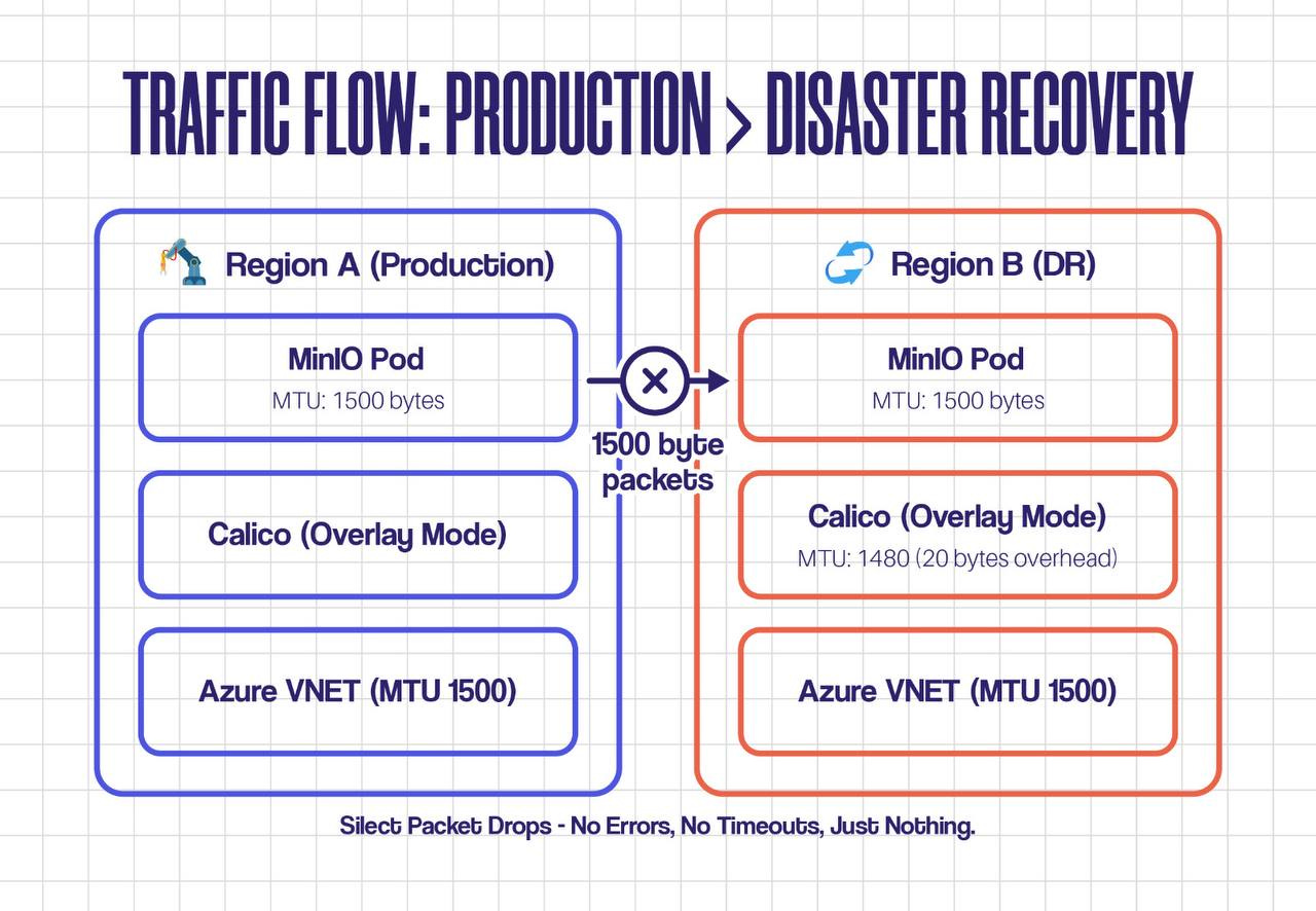 ping -M do -s 1500 minio-dr.prod.svc.cluster.local # Timeout ← AHA!